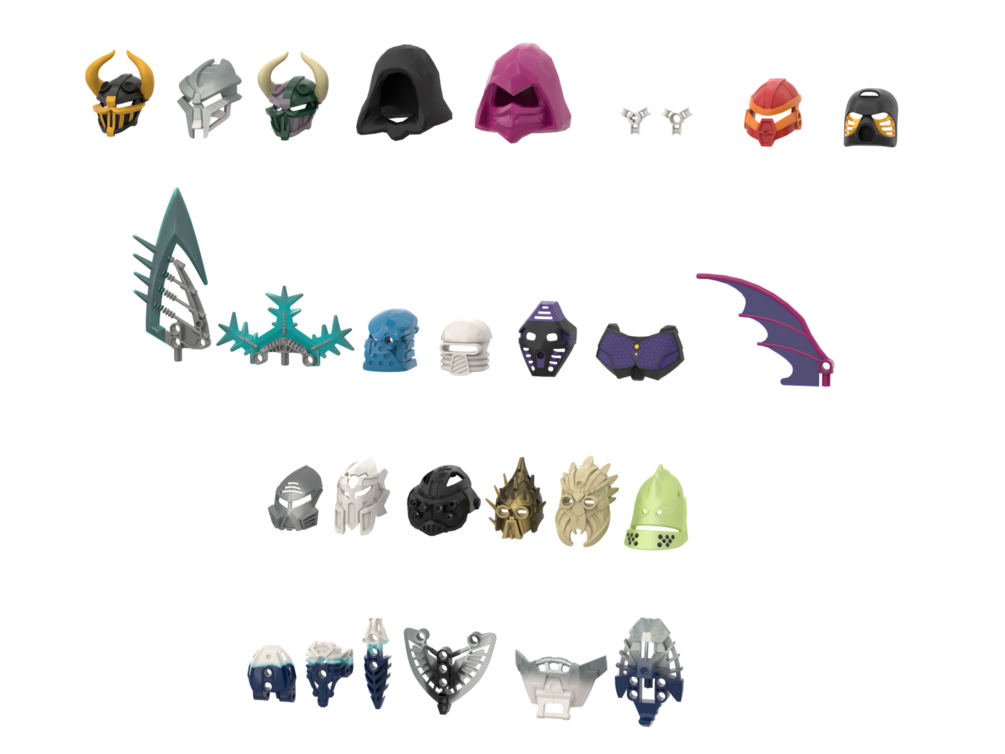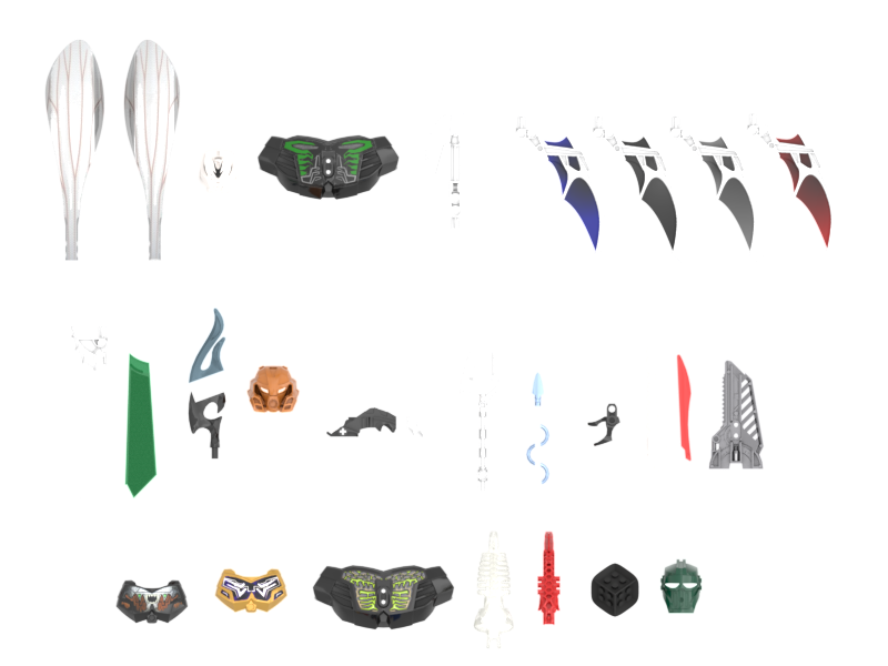 The main assortment of miscellaneous custom and missing official parts imported from LDD, as well as existing Stud.io or custom parts made by others with fixed connections and scaling. Now also includes my custom Nuva Symbols Pack, split mask components based on the mocs of the Toa Cordak by TheLegendReborn, and plenty of other split component parts to allow for more color customization in Stud.io without having to rely on image editing for completed renders.